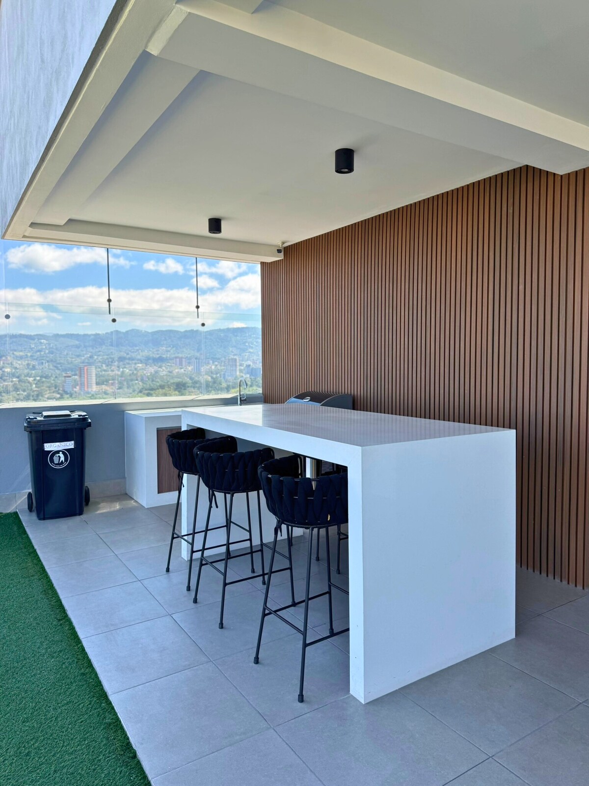 Apartamento modificado de 2 a 1 habitación para ofrecer grandes ambientes y una vista estupenda a la ciudad y los volcanes. Sus más de 85 m2 se conjugan con un equipamiento y decoración de primer nivel. Contamos con piscina climatizada a 31 C, gimnasio equipado, areas sociales en el piso 25 como un Fire Pit; asi como supermercado, salon de belleza y banco en el lobby. Ubicado en la zona hotelera de la ciudad o Zona Viva a pasos de los mejores hospitales, restaurantes y centro comerciales