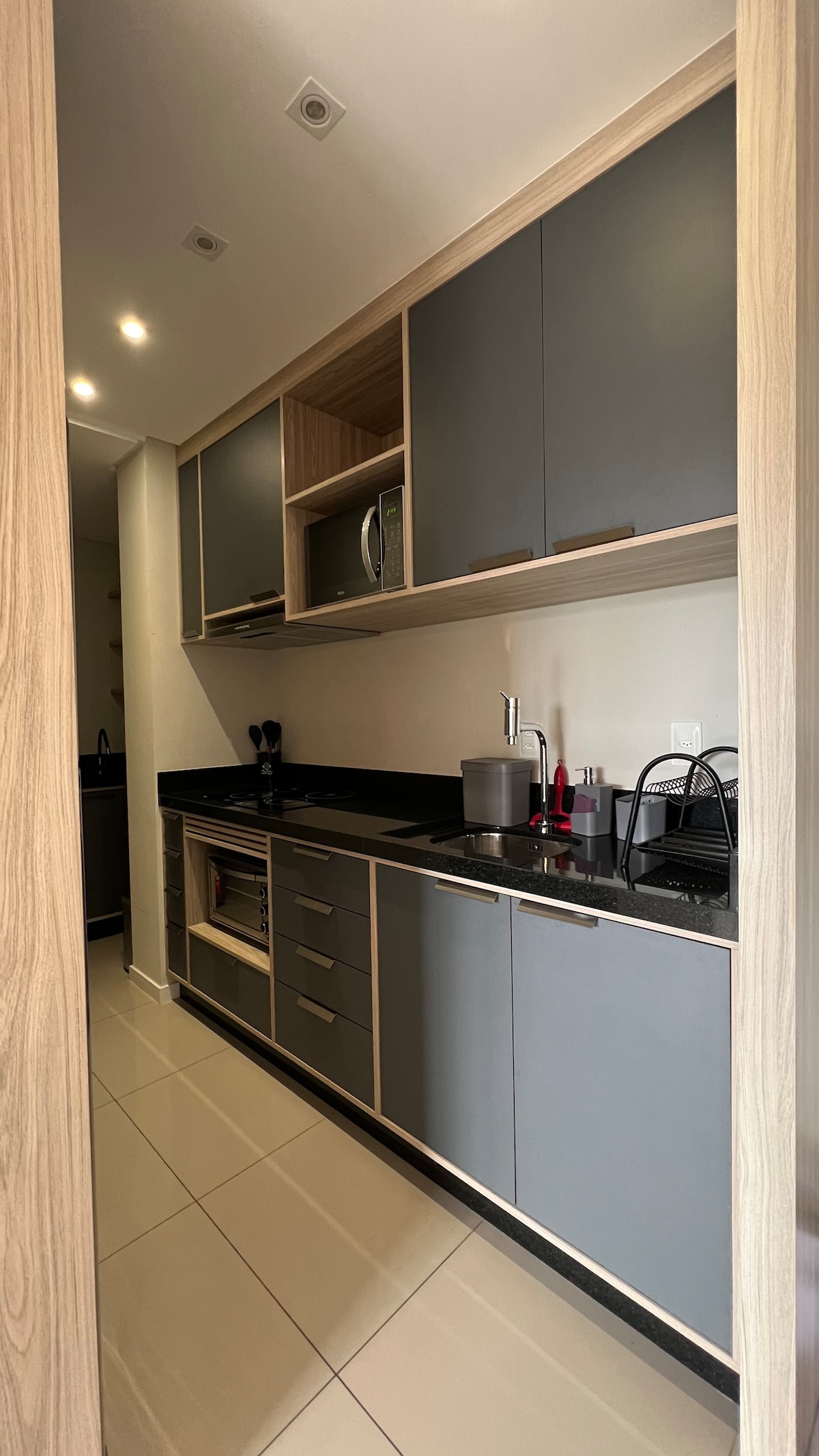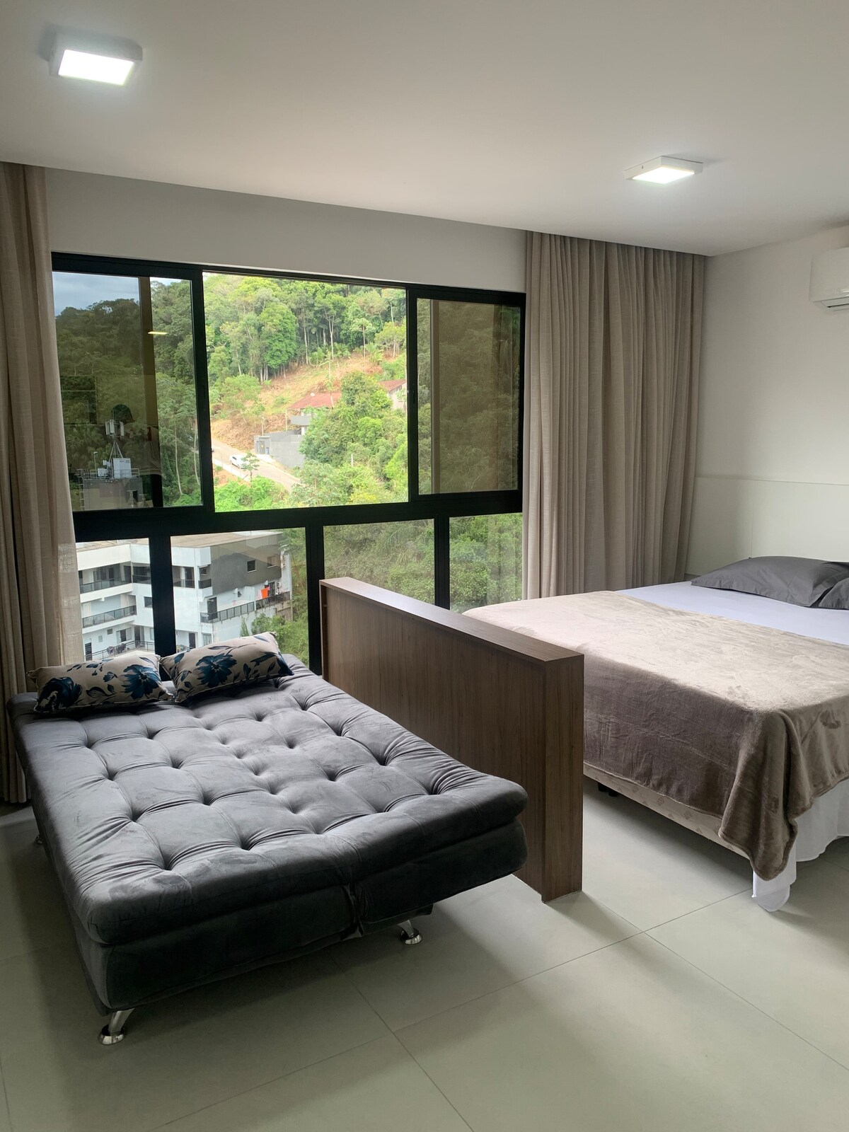 Sofisticado apartamento tipo estudio ubicado a 800 metros del parque Vila Germânica, lugar de eventos como el Oktoberfest. Rodeado de restaurantes, bares y supermercados. Todo para su comodidad: Smart TV 50" Samsung, aire acondicionado split, ducha de gas, wifi fibra 240mb, cocina completa con heladera Brastemp, microondas, horno, estufa, campana extractora, cafetera, purificador de agua, lava y seca, armarios, y por supuesto ¡una cama queen con el mejor colchón!